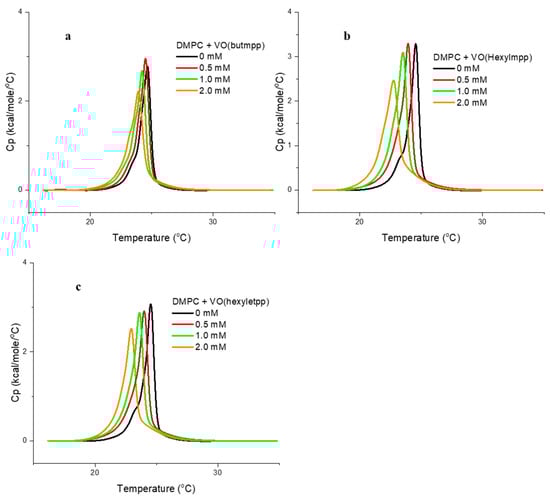 Representative DSC thermograms for selected DMPC/complex systems are shown in Figure 1, and the corresponding thermodynamic parameters are summarized in Table 4. These results provide insight into the effects of three vanadium complexes, VO(butnmpp), VO(hexylmpp), and VO(hexyletpp), on the thermotropic behavior of DMPC. Specifically, changes in the main phase transition temperature (Tm), transition width (ΔT1/2), and transition enthalpy (ΔH) were evaluated to quantify the interaction with the lipid bilayers.