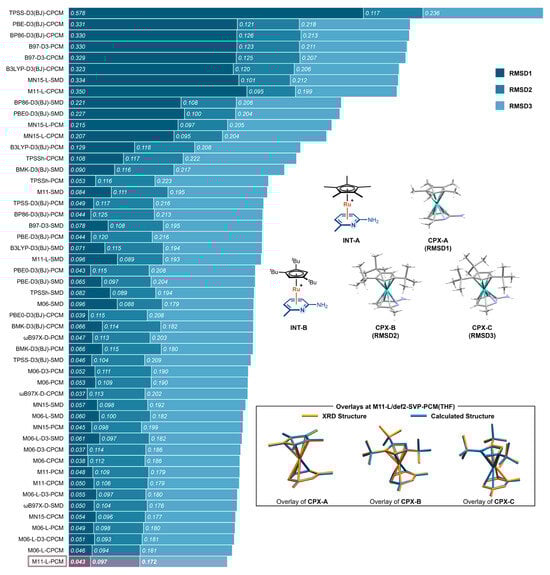 RMSDs between optimized and crystallographic geometries for CPX-A, CPX-B, and CPX-C using 51 different DFT functional–solvation model combinations. Bars are sorted in descending order of the total RMSDs across the three complexes.