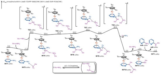 We first examined the reaction mechanism for ortho-aminopyridine; the complete free-energy profile is shown in Figure 2. The catalytic cycle is initiated by η6-coordination of the substrate to Ru(II), furnishing the π-complex INT1-ortho. Approach of methylamine gives the more stable, hydrogen-bonded adduct INT2-ortho, from which nucleophilic addition occurs via TS3-ortho to form the Meisenheimer intermediate INT4-ortho. The barrier from INT2-ortho to TS3-ortho is 25.7 kcal/mol, representing the first significant ascent along the pathway.