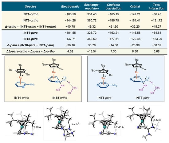 For each pathway, the change in the interaction energy terms from INT1 to INT8 (Δ-ortho and Δ-para) reflects the energetic contributions of the CpRu(II)–substrate interaction to the stabilization/destabilization of the Meisenheimer intermediate relative to the resting π-complex. Comparing these Δ values between the ortho and para cases yields the ΔΔpara–ortho values, which capture the subtle influence of the substitution pattern on each interaction component and, ultimately, on the stability of the Meisenheimer intermediate.
