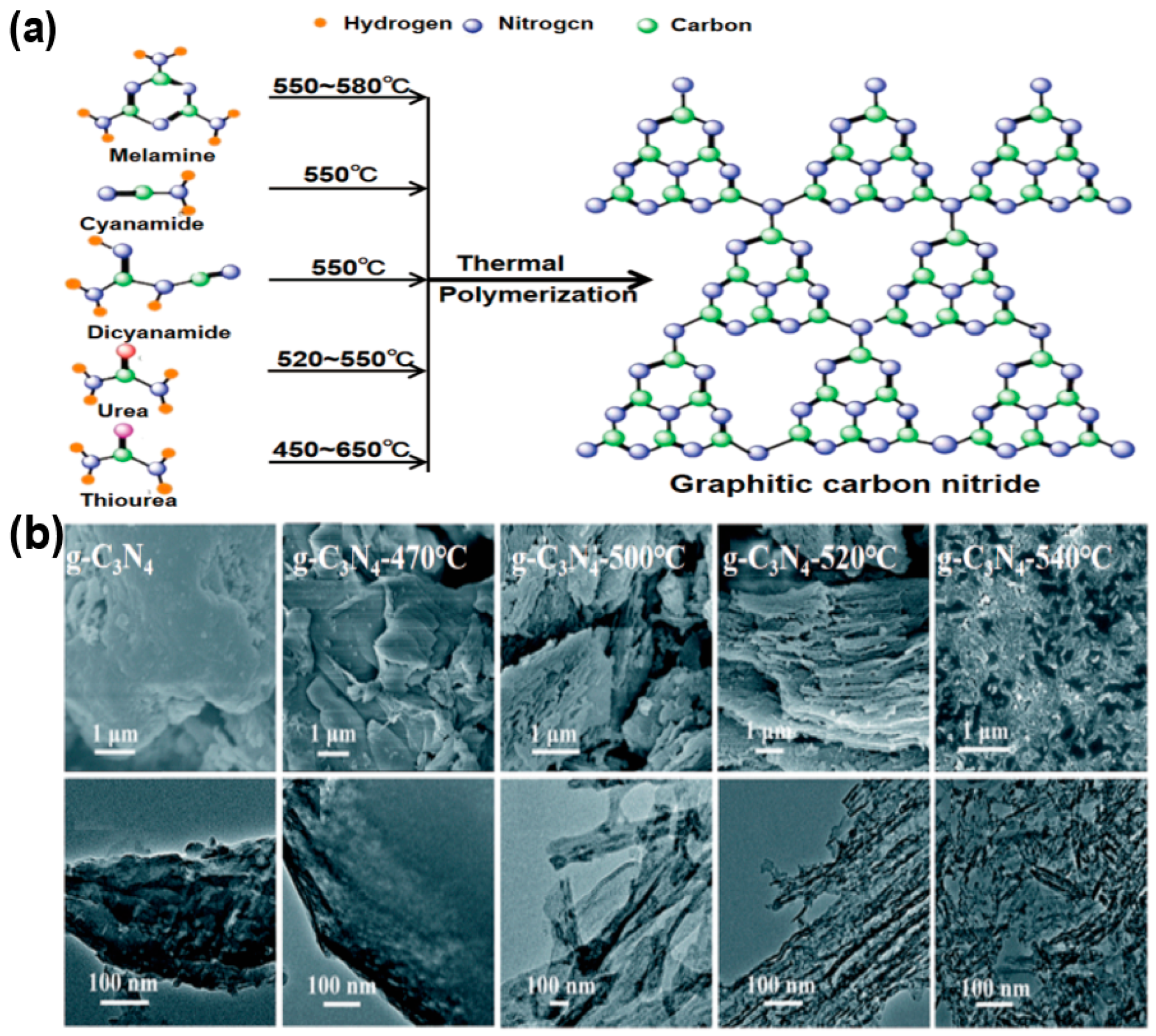 Thermal polymerization | Cost-efficient equipment, mature scalable process, high-purity product output | severe aggregation, low specific surface area, crystallinity, poor charge transfer efficiency, inadequate morphology control, high energy | Bulk/granular morphologies | photocatalysts, electrodes, catalyst supports | [32] |