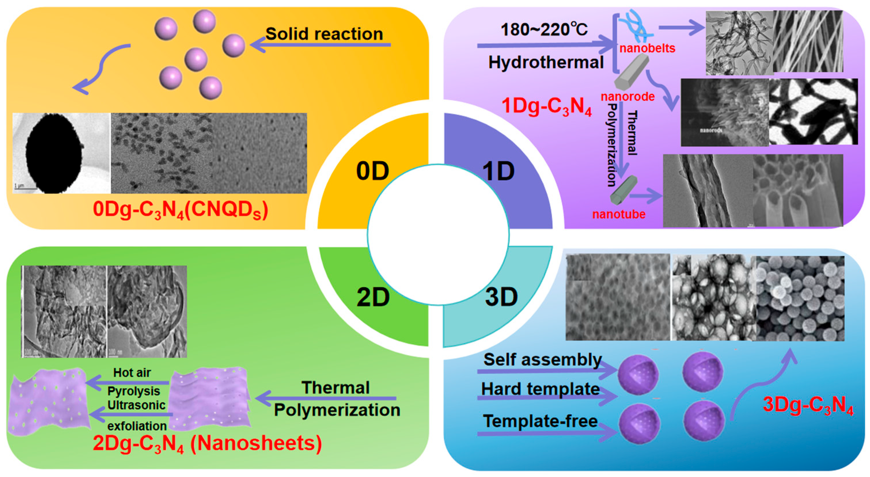 - Wang, J.; Wang, S. A critical review on graphitic carbon nitride (g-C3N4)-based materials: Preparation, modification and environmental application. Coord. Chem. Rev. 2022, 453, 214338. [Google Scholar]