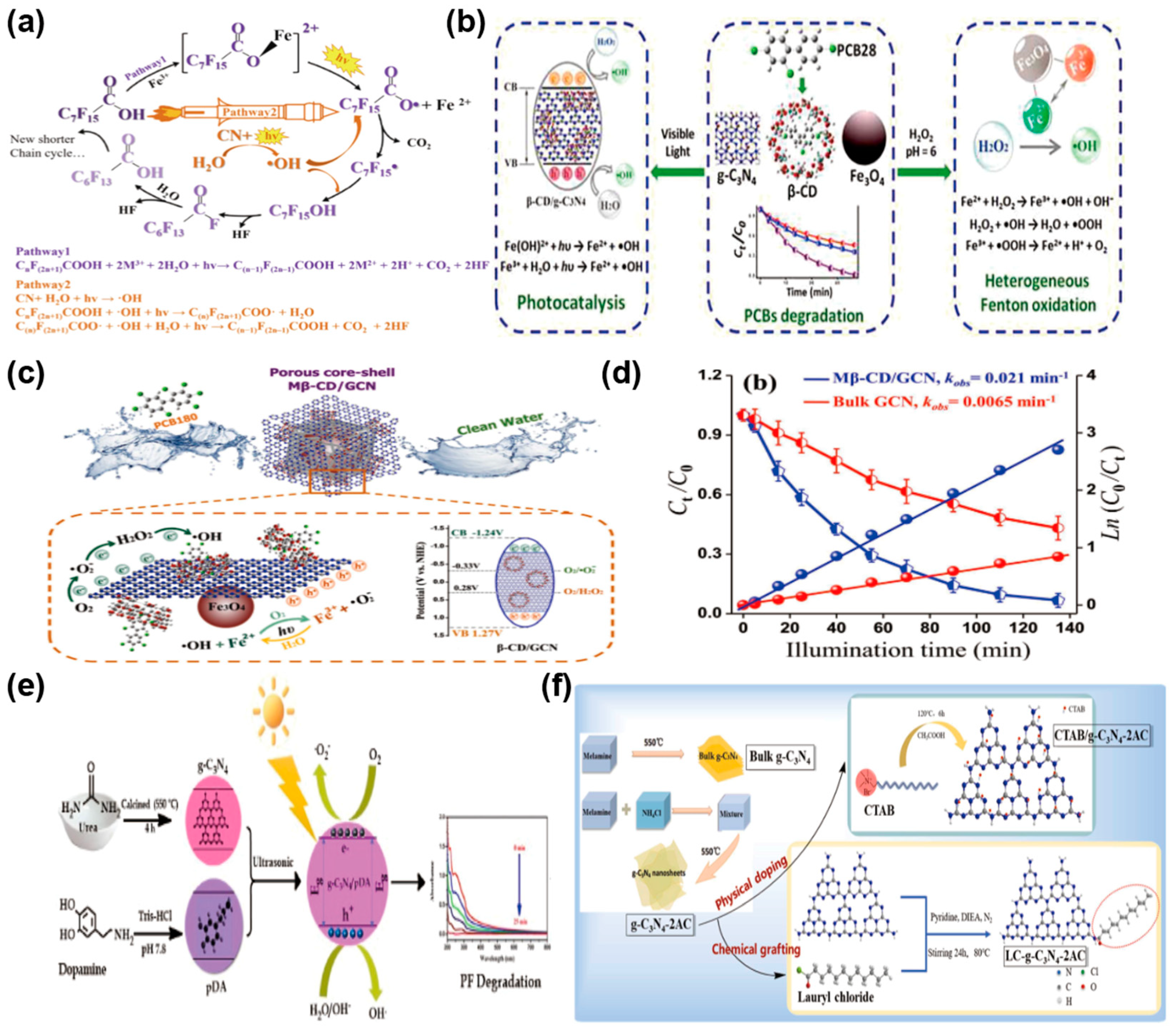 - Currently, g-C3N4-based photocatalytic materials primarily rely on photoexcitation to generate strongly oxidative radicals for organic pollutant degradation, whose activity ceases without illumination. To address this limitation, integrating g-C3N4 with piezoelectric materials enables persistent radical generation via the piezoelectric effect even in dark conditions for emerging contaminant degradation. Simultaneously, the built-in electric field from piezoelectric coupling facilitates photogenerated charge separation and reduces recombination, thereby enhancing photocatalytic efficiency.