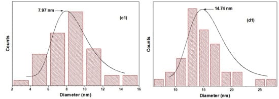 FESEM top-view images of TiO2 NTs before (a) and after the deposition of PbS NPs at different SILAR cycle number “n” (b) 3 cycles (c) 5 cycles, and (d) 8 cycles. All images were captured at almost a magnification of 100,000×; the scale bar in each image represents 100 nm. The inset of (a) presents a cross-section of pure TiO2 nanotubes. The size distribution of PbS NPs in 5PNTs and 8PNTs is presented in (c1,d1).