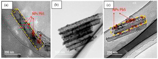 TEM images confirm the presence of PbS NPs on the external walls of the nanotubes and even inside them.