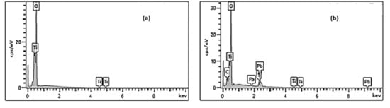 The energy dispersive X-ray analysis (EDX) spectrum (Figure 3) shows the presence of Titanium (Ti), oxygen (O), lead (Pb), and sulfur (S), indicating the decoration of the TiO2 NTs by the PbS NPs. In all EDX analyses, no characteristic peaks belonging to impurities are observed, indicating the high purity of the prepared samples.
