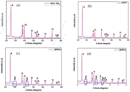 Figure 4 depicts the XRD patterns of TiO2 NTs and PbS NPs-TiO2 NTs. The main diffraction peaks are located at 2θ (°) 201 = 25.15, 37.85, 47.92, 53.80, 55.04, 62.63, and 68.83, which are related to the crystalline anatase phase of TiO2 (in good agreement with JCPDS No. 894921). These peaks are labeled by the letter “A” in Figure 4. Sharp XRD peaks indicate good TiO2 NTs crystallinity after the two-step anodization process. Additionally, peaks corresponding to metallic titanium (labeled as “Ti” in Figure 4) are observed, which originate from the underlying Ti substrate used for nanotube growth. These substrate peaks are expected and commonly reported in XRD analysis of anodized TiO2 nanotube arrays grown on titanium foil, as the X-ray penetration depth extends beyond the nanotube layer thickness. Moreover, we may notice the appearance of three peaks assigned to the (200), (220), and (311) crystallographic orientations of the cubic face-centered structure of PbS that are observed at 2θ = 30.00°, 42.93°, and 50.85° (JCPDS No. 781901), respectively. It is worth noting that the intensity of the XRD peak of PbS increases as the number of SILAR cycles “n” rises, leading to further loading of PbS on the TiO2 NTs. The PbS XRD peaks are difficult to detect for 3PTNs (n = 3), probably due to the low density of the PbS NPs at the top of the NTs (Figure 1a). The full width at half maximum (FWHM) and the intensity of the peaks, as well as the crystallite size of PbS in the 5PTNs (n = 5) and 8PTNs (n = 8) samples, are reported in Table 2. We notice a decrease in the FWHM as the number of SILAR cycles “n” increases.