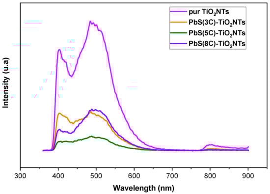 Photoluminescence (PL) measurements were performed to estimate the influence of PbS NPs on photogenerated charge carriers’ dynamics in TiO2 NTs. Figure 5 exhibits the PL spectra of pure TiO2 NTs and that of the nanohybrid systems {NPs PbS}n=3, 5 and 8—TiO2 NTs, after a light excitation having a 340 nm wavelength.