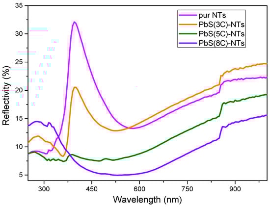 It is clearly observable that the diffuse reflectivity of the PbS NPs—TiO2 NTs structures decreases compared to pure TiO2 NTs as “n” increases. This result could be explained by the formation of an ordered nanostructure (PbS NPs) suitable for light trapping. The obtained data were processed by referring to the Kubelka–Munk (K-M) theory [40] given by Equation (2), which links the absorption coefficient α to the reflection coefficient R.