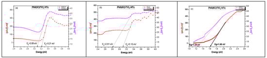 Extrapolation of the gap (using the Kubelka–MunK theory) of TiO2 NTs after the deposition of PbS nanoparticles at different numbers of SILAR cycles “n” (a) 3 cycles; (b) 5 cycles and (c) 8 cycles.