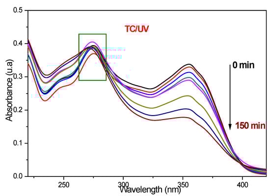 The {PbS NPs} n-TiO2 NTs structures (where n = 0, 3, 5, and 8, which is the number of SILAR cycles) were tested in the photodegradation of tetracycline under ultraviolet irradiation; the effect of the deposition of PbS NPs on the photoactivity of TiO2 NTs was studied. The tested samples were designated as pure NTs, 3PNTs, 5PNTs, and 8PNTs. The used irradiation source is a xenon lamp emitting between 300 and 450 nm with a UV filter at 365 nm. In order to be able to interpret the obtained results, we resort to a series of control experiments. The first check is to see whether we can degrade tetracycline without using TiO2 NTs as a photocatalyst (photolysis), just by exposing the TC to ultraviolet irradiation. Figure 8 shows the UV–vis absorption spectra of light-photodegraded TC (10 mg/L) without introducing a photocatalyst in the solution. It is clearly observable that in the absence of the photocatalyst and after 150 min of UV irradiation, there is a reduction of the TC absorption band at 355 nm; however, there is no observable degradation at the TC characteristic peak at 275 nm; this proves the possibility of the formation of intermediate molecules during irradiation time.