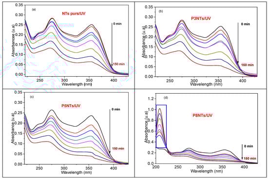 However, when the number of SILAR cycles increases up to 8 cycles, the surface coverage of the NTs by the PbS NPs increases, and the degradation decreases slightly to about 82%, giving rise to the formation of intermediate products, which absorb at 208 nm and whose concentration increases with irradiation time (Figure 9d).