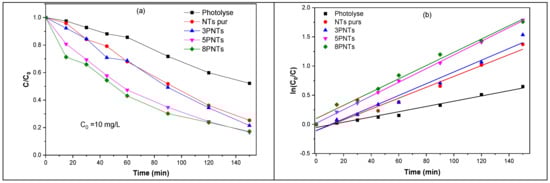 Figure 10a illustrates the photodegradation kinetics of TC under UV irradiation for each sample; it represents the variation of the ratio C/C0 versus the irradiation time (where C0 and C are the concentrations of TC before and after irradiation, respectively). Note that the blank experiment (without any photocatalyst, i.e., photolysis) shows 327 that TC is sensitive to light under UV irradiation. We found that photolysis under 150 min of UV irradiation can degrade 47% of TC. The 5PNTs sample has the highest activity with 84% degradation of TC during 150 min of UV irradiation. This result is due to the existence of PbS NPs on the TiO2 NTs, which leads to an efficient transfer of excited electrons from the PbS nanoparticles to the conduction band of the TiO2 NTs, hence improving charge carrier separation and the decrease in their recombination rate.
