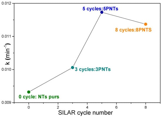 Figure 11 illustrates the variation of the rate constant as a function of SILAR cycle number of PbS NPs deposition on TiO2 NTs. The kinetic analysis shows that TC photolysis is a slow photodegradation process (k = 0.0045 min−1), which can be significantly improved by introducing pure TiO2 NTs (k = 0.0093 min−1). The 5PNTs photocatalyst demonstrates the highest activity with a rate constant of 0.0117 min−1, followed by 8PNTs (0.0113 min−1) and 3PNTs (0.0100 min−1). All correlation coefficients (R2) range from 0.9675 to 0.9990, confirming good agreement with the pseudo-first-order kinetic model. This demonstrates that associating TiO2 NTs with PbS NPs effectively improves the photocatalytic activity for TC degradation under UV irradiation.