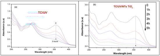 UV–vis absorbance spectra of TC (20 mg/L) recorded over time (1, 2, 3, 4, and 5 h): (a) without photocatalyst (photolysis) and (b) in the presence of metallic TiO₂ NTs under UV irradiation.