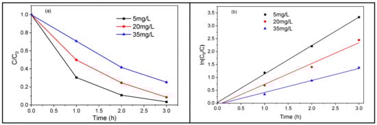 In photocatalysis, the degradation efficiency depends on the pollutant amount; hence, we will study quantitatively the TiO2 NTs-based photodegradation rate of TC for different initial concentrations. A 3 h UV irradiation of 5, 20, and 35 mg/L of an initial concentration of TC leads to a photodegradation of about 96, 91, and 74% of the pollutant, respectively (Figure 13a). This shows that the removal efficiency of TC decreases when its concentration increases. Figure 13b displays the plots of Ln (C0/C) versus irradiation time for different amounts of doses of TC. The experimental data were fitted by a pseudo-first-order kinetic equation, and the corresponding rate constants were calculated: 1.1032, 0.8048, and 0.4658 min−1 for an initial TC concentration of 5, 20, and 35 mg/L, respectively (Figure 13b). The increase in the initial TC concentration leads to a decrease in the degradation rate constant. This could mean that for high enough TC concentrations, hydroxyl radicals become the limiting reactant, and therefore lower-order kinetics occur [41].