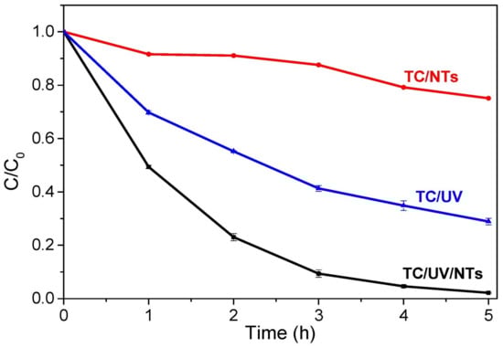 TC concentration ratio versus UV irradiation time: TC/UV (photolysis, without photocatalyst), TC/NTs (in presence of TiO2 NTs), TC/UV/NTs (in presence of TiO2 NTs and UV irradiation).