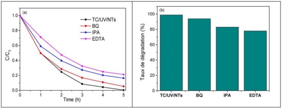 Three types of active species (superoxide radicals: ·O2−, hydroxyl radicals: OH·, and holes: h+) participate in the photodegradation of pollutants by TiO2. In order to know which active species participate in the UV—photocatalytic degradation of TC via TiO2 NTs and in order to understand the different reactions and mechanisms involved during this process, three types of scavengers (benzoquinone: BQ, isopropanol: IPA, and ethylenediaminetetraacetic acid: EDTA) were used to trap O2−, OH·, and h+, respectively. The introduction of EDTA significantly reduces the photodegradation efficiency of TC from 99 to 79% (Figure 15a); this indicates that the holes (h+) actively participate in the photocatalytic degradation of the antibiotic. When IPA is used, the photodegradation of TC decreases to 83%, indicating that OH· radicals are also important species that contribute to the photodegradation of TC. However, only a slight decrease in the photodegradation efficiency of TC (5%) was observed in the presence of BQ, revealing that superoxide radicals, O2−, play a minor role in the photodegradation process. Therefore, h+ and OH· radicals are the main active species prevailing in the photodegradation of TC via TiO2 NTs under UV irradiation (Figure 15b).
