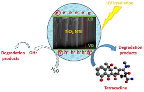 The challenge of pollution in its various forms is becoming more and more pressing in today’s world. Water pollution, in particular, is a huge problem caused primarily by current industrialization practices. Various effluents are released into water resources without treatment, instantly polluting the water. Textile, dyeing, and printing industries discharge colored water into nearby water resources without treatment. This colored water is highly toxic and harmful. Significant efforts have been employed to develop suitable purification methods for dye removal. Various semiconductors are used as photocatalysts to degrade and destroy dyes, including carbon-based photocatalysts [1], conductive polymers [2], and metal-oxide semiconductors (i.e., ZnO [3], Al2O3 [4], Fe3O4 [5], and SnO2 [6]). Among the variety of semiconductors, Titanium Dioxide (TiO2), an n-type oxide semiconductor material, promoted tremendous interest for its applications in energy and environmental areas. TiO2 is widely used in photocatalytic processes due to several key properties. These include its non-toxic nature, photosensitivity, direct band gap energy (3.2 eV for anatase and 3.0 eV for rutile), and excellent chemical and mechanical stability. It has been shown that TiO2 can exist as nanoparticles (NPs), nanowires, nanofibers, or nanotubes (NTs). The nanotubular structure of TiO2 has attracted significant attention recently. Compared to other morphologies, TiO2 nanotubes offer a highly specific surface area. This enhanced surface area increases the absorption of organic molecules during photocatalytic reactions. Moreover, it has been found that crystallized TiO2 NTs have high photocatalytic performance, good electronic conductivity, and mechanical stability [7]. Self-organized and vertically oriented TiO2 NTs are prepared by electrochemical anodization of titanium foil. This morphology offers two key advantages: large effective surface area and efficient vertical charge carrier transport. Indeed, this transport mode can facilitate the collection and separation of photogenerated charges, much in demand for high-performance photoactive materials [8,9]. Several studies focused on the degradation of antibiotics, in particular tetracycline (TC), using TiO2, mainly in its powder form. For example, [10] studied the photocatalytic degradation of TC in an aqueous solution by the P25-TiO2 (80% anatase and 20% rutile, particle size = 20–30 nm) under UV irradiation. They were able to remove 95% of TC and 60% of the total organic carbon (TOC) after 60 min of irradiation and detected NH4 + ions among the final by-products. Similarly, [11] improved the photodegradation of TC by the P25- TiO2 by adding hydrogen peroxide (H2O2). The latter behaves as a trap for electrons from the TiO2 conduction band, thus reducing the electron-hole recombination rate, inducing a higher concentration of OH radicals [12], and leading to faster photodegradation of organic pollutants. Reyes et al. [13] also studied the photodegradation of TC by the P25-TiO2 powder using different light sources; they were able to degrade 100% of TC after 120 min of irradiation with a high level of mineralization (90%). These results are similar to those obtained by Palominos et al. [14], who studied the degradation of TC and obtained an optimal degradation rate (100%) with 50% mineralization. However, no study of the photodegradation of TC in aqueous solution by TiO2 NTs has been reported despite the advantages of using NTs in the photodegradation of pollutants compared to the powder. Indeed, the use of TiO2 NTs immobilized on Ti substrates makes it possible to avoid post-separation and a long recovery time by centrifugation and filtration of the photocatalyst particles. In turn, this long recovery period can influence the results, especially in the case of large photocatalytic reactors that require a large amount of photocatalyst. However, despite its good photoactivity, pure TiO2 NTS have some shortcomings, such as a large band gap of 3.273 eV, which limits the photon absorption of the TiO2 anatase phase to a small fraction of the solar energy (less than 5%). In addition, the rapid recombination of photogenerated electron/hole pairs also leads to a decrease in the photocatalytic efficiency [15]. Recent studies have demonstrated various strategies to overcome these limitations in TiO2-based photocatalytic systems for water treatment applications [16]. In recent years, considerable efforts have been made and many strategies have been considered to improve the optical properties and the photocatalytic activity of TiO2 NTs by extending the absorption range in visible light, and decreasing the recombination rate of the photogenerated electron-hole pairs during the photocatalysis process [17,18,19,20]. Among the strategies adopted, TiO2 NTs were doped with noble metals [21,22,23] and with non-metallic elements [24,25,26] or by forming heterostructures [27,28,29,30]. Several works focused on TiO2 NTs modified by PbS NPs for the photodegradation of dyes, pharmaceuticals, and organic and industrial compounds. Indeed, PbS is a p-type semiconductor having a narrow band gap (0.41 eV bulk state), a rather long exciton lifetime (200–800 ns), and a large excitonic Bohr radius (~18 nm) [31], which leads to extended quantum size effects [32]. PbS has proven its role in improving the electronic properties of TiO2, particularly by decreasing its carrier recombination rate and its optical band gap. Palma et al. [33] biologically synthesized PbS NPs and PbS/TiO2 composites and studied their potential as catalysts in the photodegradation of pharmaceuticals. They used chloramphenicol (CAP), a bacteriostatic antibiotic from the phenicol family, and paracetamol as the most commonly used analgesic and antipyretic drug. Hou et al. [34] showed that TiO2 NTs decorated with PbS NPs by the hydrothermal method are more efficient for the photodegradation of Rhodamine B (RhB) and Methylene Blue (