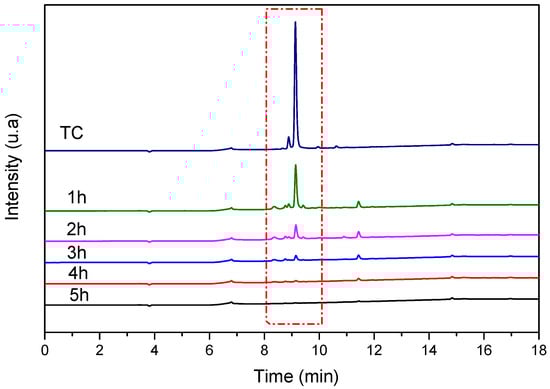 The progressive disappearance of the TC peak with no corresponding increase in intermediate product peaks suggests efficient mineralization rather than simple molecular transformation or surface adsorption. Control experiments showed that TC adsorption on TiO2 NTs in the dark reached equilibrium within 1 h with minimal TC removal, confirming that the observed peak disappearance under UV irradiation is due to photocatalytic degradation.
