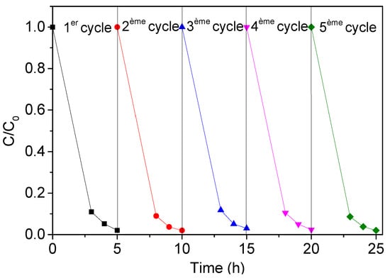 The TiO2 NTs must be stable over time and able to be reused with limited performance losses. To evaluate the reusability of the photocatalyst, a series of recycling experiments (cyclic photodegradation of TC in the presence of TiO2 NTs) were performed. Five consecutive tests of photodegradation were carried out under the same experimental conditions (20 mg/L of TC, 5 h of UV irradiation). After each run, we used a fresh initial solution of TC (20 mg/L). We observed that the photocatalyst could be used successfully for at least five consecutive cycles (Figure 18) without any noticeable loss in performance. Considering their significant photocatalytic activity and their stability, TiO2 NTs constitute an excellent candidate for the photodegradation of antibiotics, in particular tetracycline (TC).