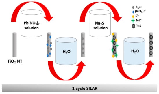 The synthesis of TiO2 NTs was based on previous reports [43]. Briefly, the electrochemical growth of the nanotubes was carried out at room temperature and under identical experimental conditions; it was carried out in two steps. The first one consists of an anodization in an electrolytic cell containing 100 mL of ethylene glycol, 1% of ammonium fluoride (NH4F), and 2% of ultrapure water (H2O) with a platinum foil as counter electrode. The anodization voltage and time were fixed at 60 V and 60 min, respectively. The first TiO2 NT layer is treated in an ultrasonic bath until it is eliminated. The purpose of this step is to prepare the surface for the growth of a well-ordered and rigid nanotubular structure. In a second step, a second anodization is performed under the same experimental conditions, while fixing the anodization time to 20 min. At the end of the process, a nanotubular TiO2 layer forms on the Ti sheet; this layer is then carefully treated by low-frequency ultrasound in an ultrapure water bath in order to eliminate debris and ions formed in the superficial layer. The samples are then air-dried before proceeding to the annealing step. The crystallization of the TiO2 nanotubes in the anatase phase requires annealing for 3 h at 400 °C (5 °C/min). Finally, the samples are cooled to room temperature and ready to be sensitized with PbS nanoparticles for photocatalytic studies. For the deposition of PbS NPs, we performed the simple SILAR method. First, the cationic precursor solution was prepared by mixing (0.01 M) lead (II) nitrate (Pb (NO3)2) in 50 mL of water, while the anionic precursor solution was prepared by dissolving (0.01 M) sodium sulfide (Na2S) in water. Both solutions were well stirred to avoid any precipitation. The TiO2 NTs were successively immersed in the Pb (NO3)2 for 30 s and then in the Na2S solution for the same duration. This step allows the TiO2 substrate surface to adsorb both anionic and cationic ions. After each step of immersion, the substrate was washed with DI water to remove the excessive precursor solution and impurities. This whole process corresponds to one SILAR cycle (Figure 20). The latter is repeated n times (n cycles) to achieve {PbS NPs} n/TiO2 NTs heterojunctions (where n = 0, 3, 5, and 8); the prepared samples were denoted as NTs, 3 PNTs, 5 PNTs, and 8 PNTs, respectively.