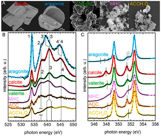 - DeVol, R.T.; Metzler, R.A.; Kabalah-Amitai, L.; Pokroy, B.; Politi, Y.; Gal, A.; Addadi, L.; Weiner, S.; Fernandez-Martinez, A.; Demichelis, R.; et al. Oxygen Spectroscopy and Polarization-Dependent Imaging Contrast (PIC)-Mapping of Calcium Carbonate Minerals and Biominerals. J. Phys. Chem. B 2014, 118, 8449–8457. [Google Scholar] [CrossRef]