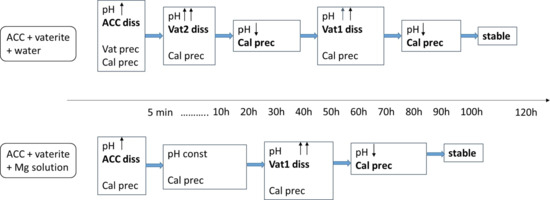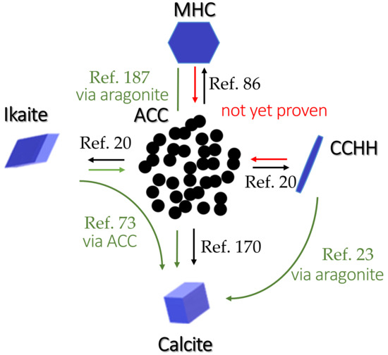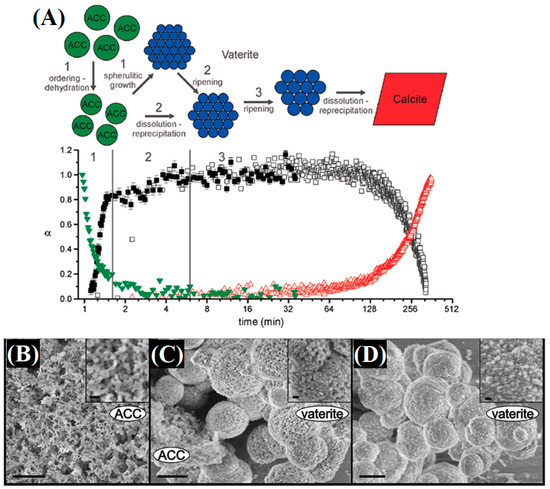 - Rodriguez-Blanco, J.D.; Shaw, S.; Benning, L.G. The Kinetics and Mechanisms of Amorphous Calcium Carbonate (ACC) Crystallization to Calcite, Viavaterite. Nanoscale 2011, 3, 265–271. [Google Scholar] [CrossRef]