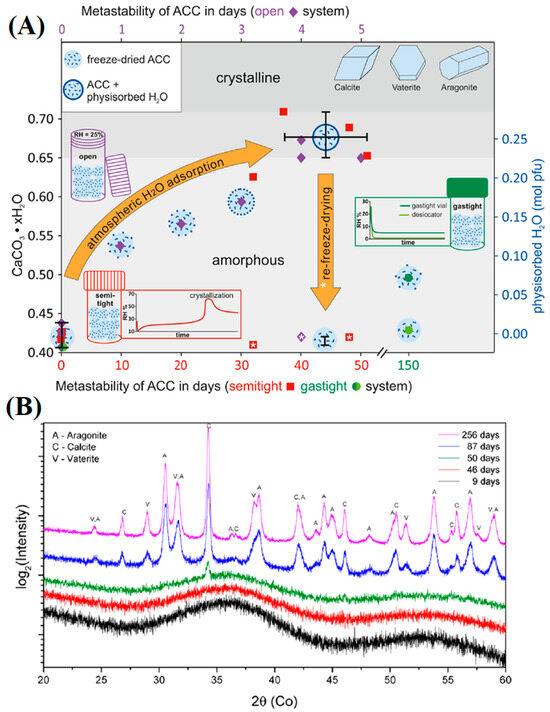 - Wang, Q.; Huang, W.; Wang, J.; Long, F.; Fu, Z.; Xie, J.; Zou, Z. Stabilization and Crystallization Mechanism of Amorphous Calcium Carbonate. J. Colloid Interface Sci. 2025, 680, 24–35. [Google Scholar] [CrossRef] [PubMed]