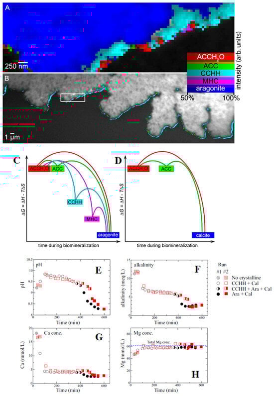 - Schmidt, C.A.; Tambutté, E.; Venn, A.A.; Zou, Z.; Castillo Alvarez, C.; Devriendt, L.S.; Bechtel, H.A.; Stifler, C.A.; Anglemyer, S.; Breit, C.P.; et al. Myriad Mapping of Nanoscale Minerals Reveals Calcium Carbonate Hemihydrate in Forming Nacre and Coral Biominerals. Nat. Commun. 2024, 15, 1812. [Google Scholar] [CrossRef]