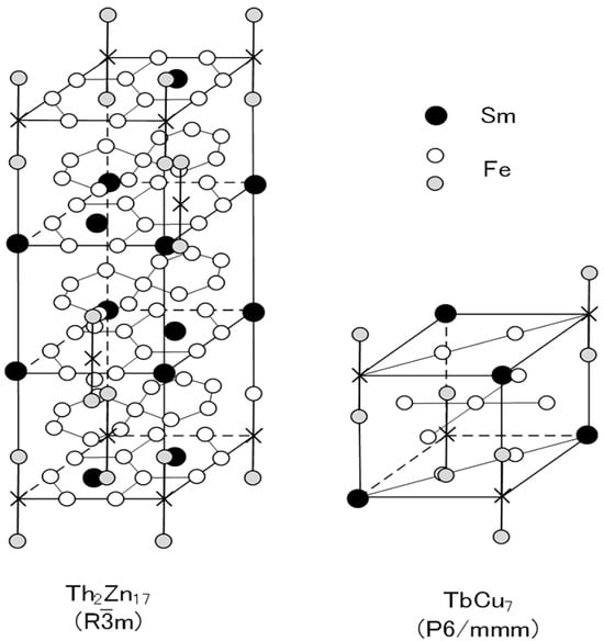 Two types of Sm-Fe-N phases have been produced: the Sm2Fe17N3 phase and the SmFe7N phase [46,58,59,60,61,62,63]. The Sm2Fe17N3 phase is obtained by the nitrogenation of Sm-Fe powder with the Th2Zn17 phase, while the SmFe7N phase is obtained by the nitrogenation of Sm-Fe melt-spun ribbon with the TbCu7 phase. The basic difference between the two phases is the crystal structure: the Th2Zn17 phase is rhombohedral, and the TbCu7 phase is hexagonal (Figure 1).
