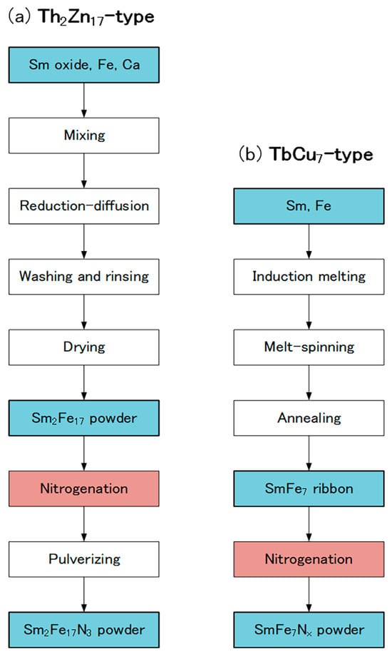 Production flows of (a) Th2Zn17-type and (b) TbCu7-type Sm-Fe-N powders.