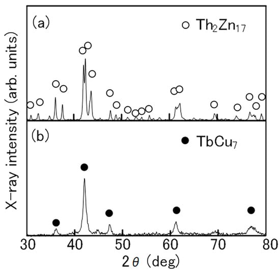 X-ray diffraction patterns of (a) Th2Zn17-type and (b) TbCu7-type Sm-Fe-N powders [64].