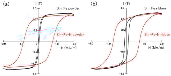 The hysteresis loops of the Th2Zn17-type and TbCu7-type Sm-Fe-N powders are shown in Figure 5. The hysteresis loops of the Th2Zn17-type and TbCu7-type Sm-Fe powders, before nitrogenation, are also shown in Figure 5 for comparison. The loops are evaluated under the applied magnetic field of 2 MA/m after the powders are embedded in paraffin. Since the Th2Zn17-type Sm-Fe-N powders are anisotropic, they were magnetically aligned before being embedded in paraffin for evaluation under an applied magnetic field of 2 MA/m. The narrow hysteresis loops of the Sm-Fe powders (before nitrogenation) indicate that their coercivity values are small. However, the Sm-Fe-N powders have wide hysteresis loops with high coercivity. This confirms that the nitrogenation of the TbCu7-type and Th2Zn17-type Sm-Fe powders significantly increased coercivity.