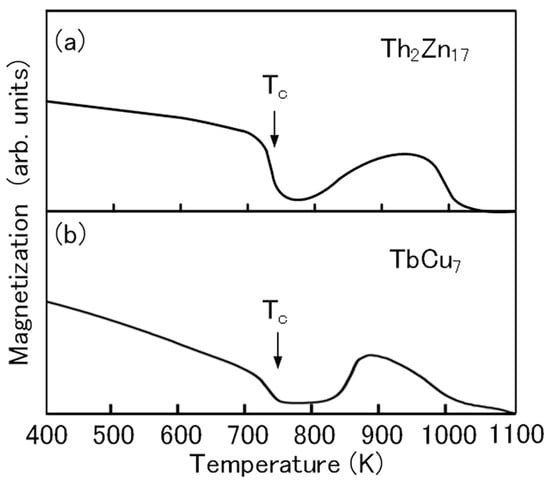 The thermomagnetic curve of the Th2Zn17-type Sm-Fe-N powder clearly shows the Curie temperature (Tc) of the Sm–Fe–N phase (Figure 6a). That of the TbCu7-type Sm-Fe-N powder is almost the same (Figure 6b). The increase in magnetization at high temperatures above 800 K is noted in the thermomagnetic curve of the Th2Zn17-type Sm-Fe-N powder. The observed increase in the thermomagnetic curve is due to the formation of the ferromagnetic phase during the thermomagnetic measurement. The Curie temperature of the ferromagnetic phase is near 1050 K, corresponding to the Curie temperature of the α–Fe phase. The increase is also noted in the thermomagnetic curve of the TbCu7-type Sm-Fe-N powder. It is believed that the α–Fe phase is formed by the decomposition of the Th2Zn17-type and TbCu7-type Sm-Fe-N phases at high temperatures [72].