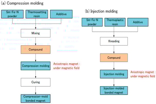 Production of Sm-Fe-N bonded magnets: (a) compression molding; (b) injection molding.
