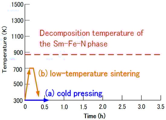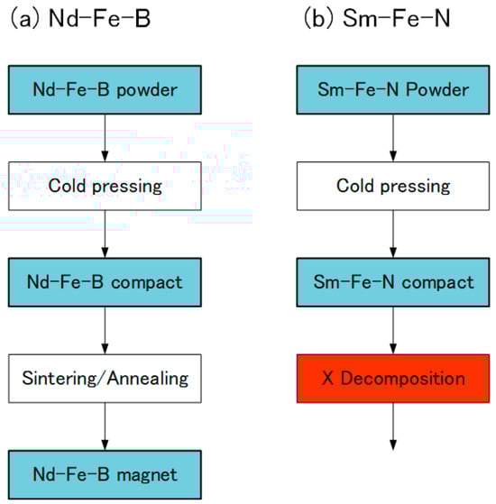 In the Nd-Fe-B sintered magnets, Nd-Fe-B powder is cold-pressed into a compact and then sintered and subsequently annealed at high temperature [25] (Figure 8). However, the same procedure cannot be applied to the Sm-Fe-N sintered magnets, because the Sm-Fe-N phase decomposes into the α-Fe and SmN phases during sintering [72]. Thus, a SmFeN sintered magnet has yet to be realized.