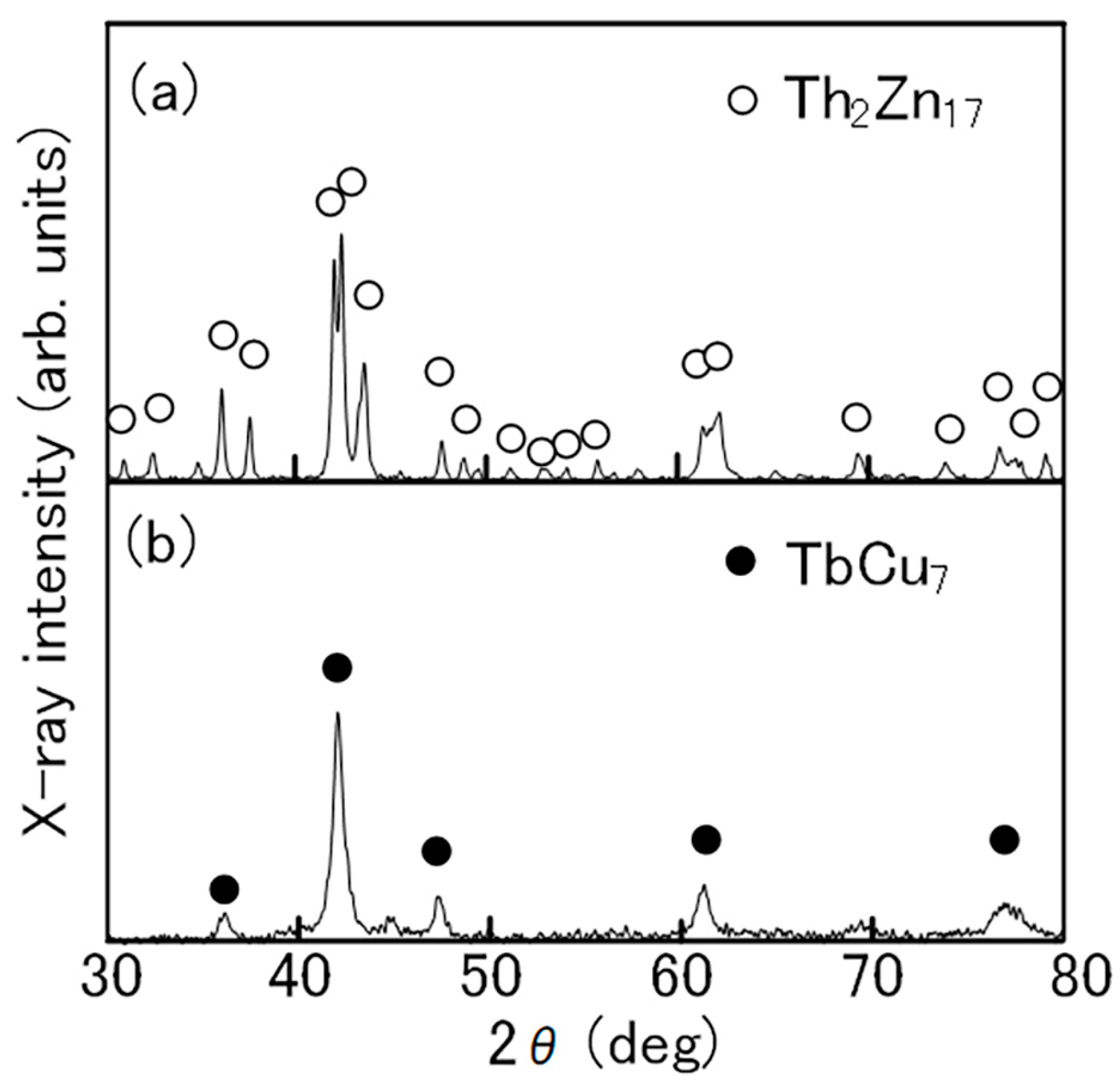 - Omatsuzawa, R.; Murashige, K.; Iriyama, T. Magnetic properties of TbCu7-type Sm-Fe-N melt-spun ribbons. Trans. Magn. Soc. Jpn. 2004, 4, 113–116. [Google Scholar] [CrossRef]