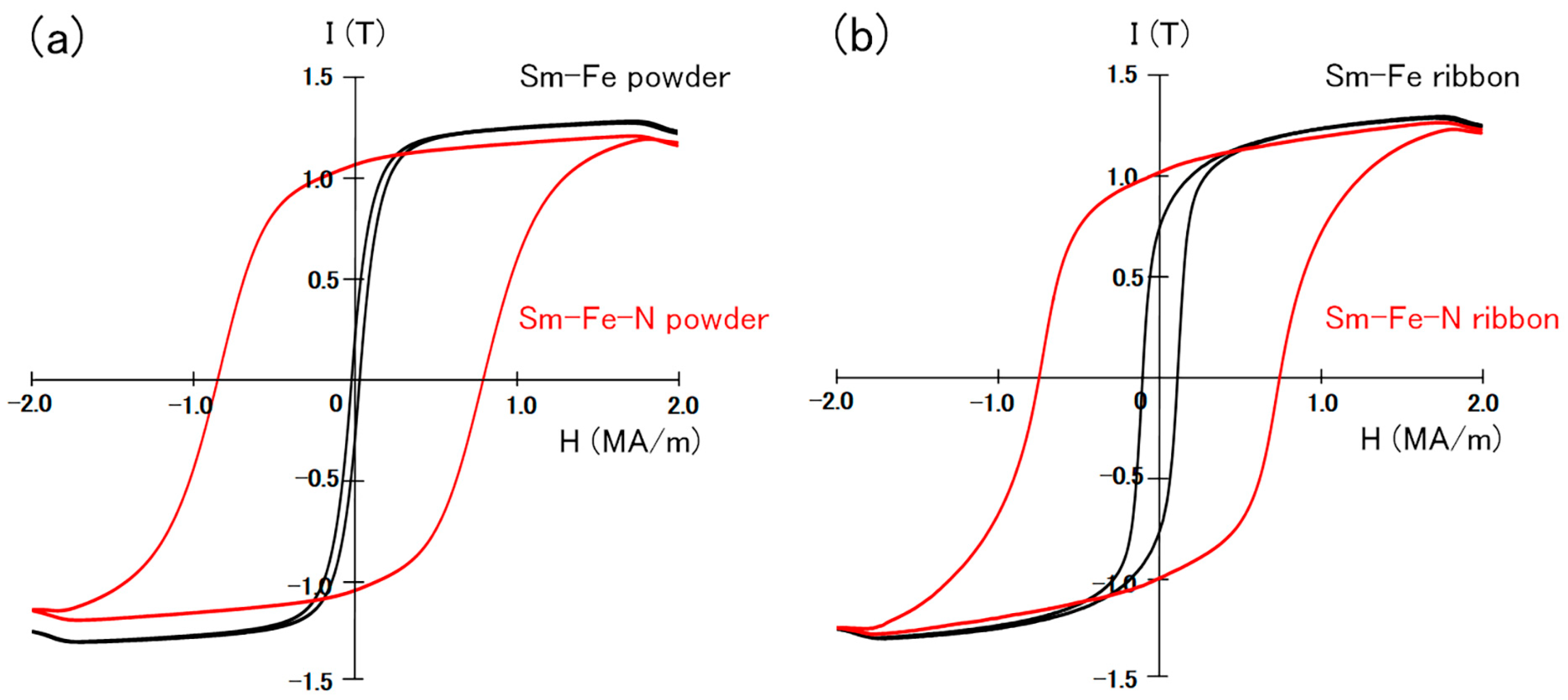 - Coey, J.M.D.; Stamenov, P.; Porter, S.B.; Venkatesan, M.; Zhang, R.; Iriyama, T. Sm-Fe-N revisited; remanence enhancement in melt-spun Nitroquench material. J. Magn. Magn. Mater. 2019, 480, 186–192. [Google Scholar] [CrossRef]