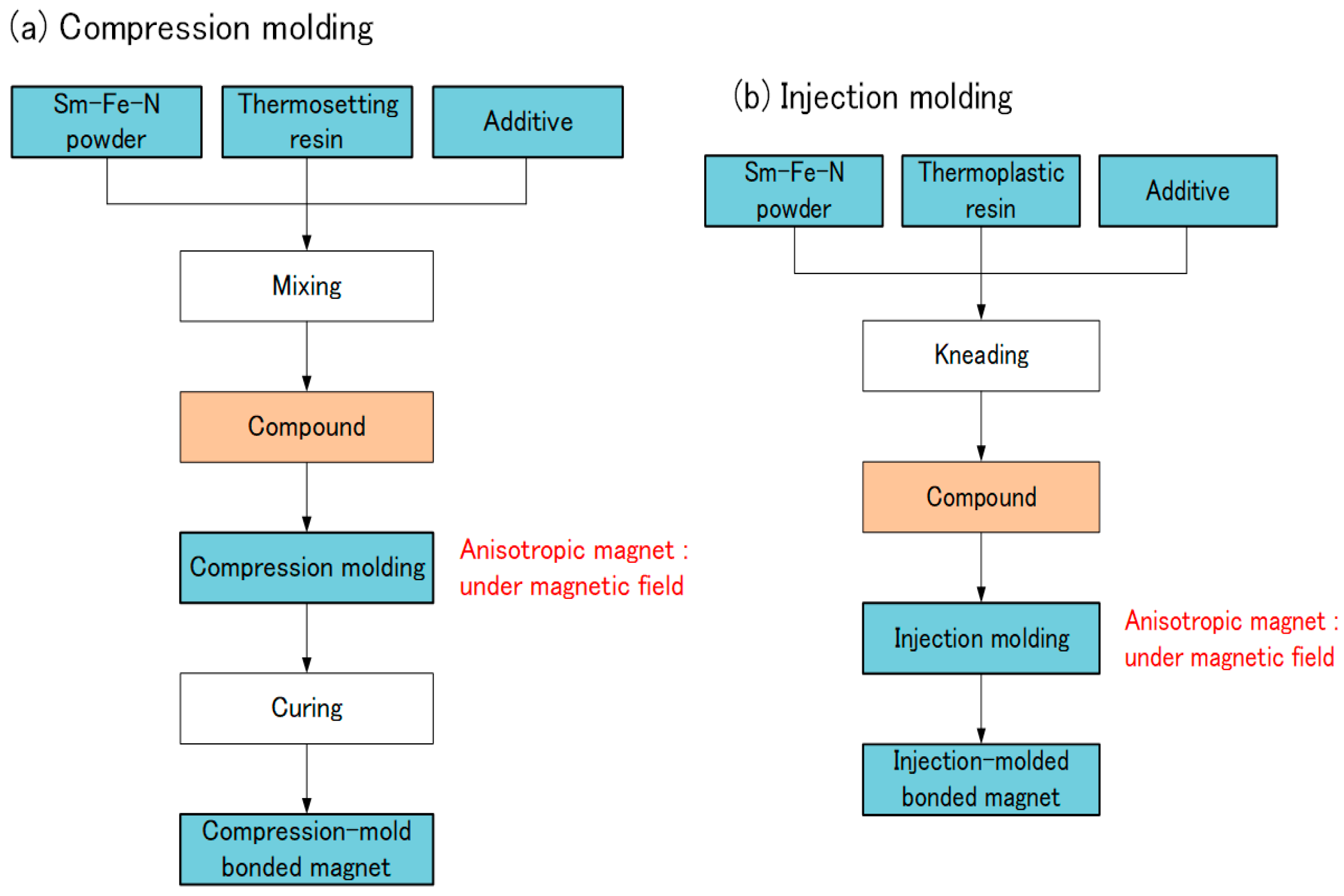 Nichia Corporation (Tokushima, Japan) | Th2Zn17-type Sm-Fe-N powder | PA12 (anisotropic) | Br = 0.78 (T) Hcj = 870 (kA/m) (BH)max = 112 (kJ/m3) |