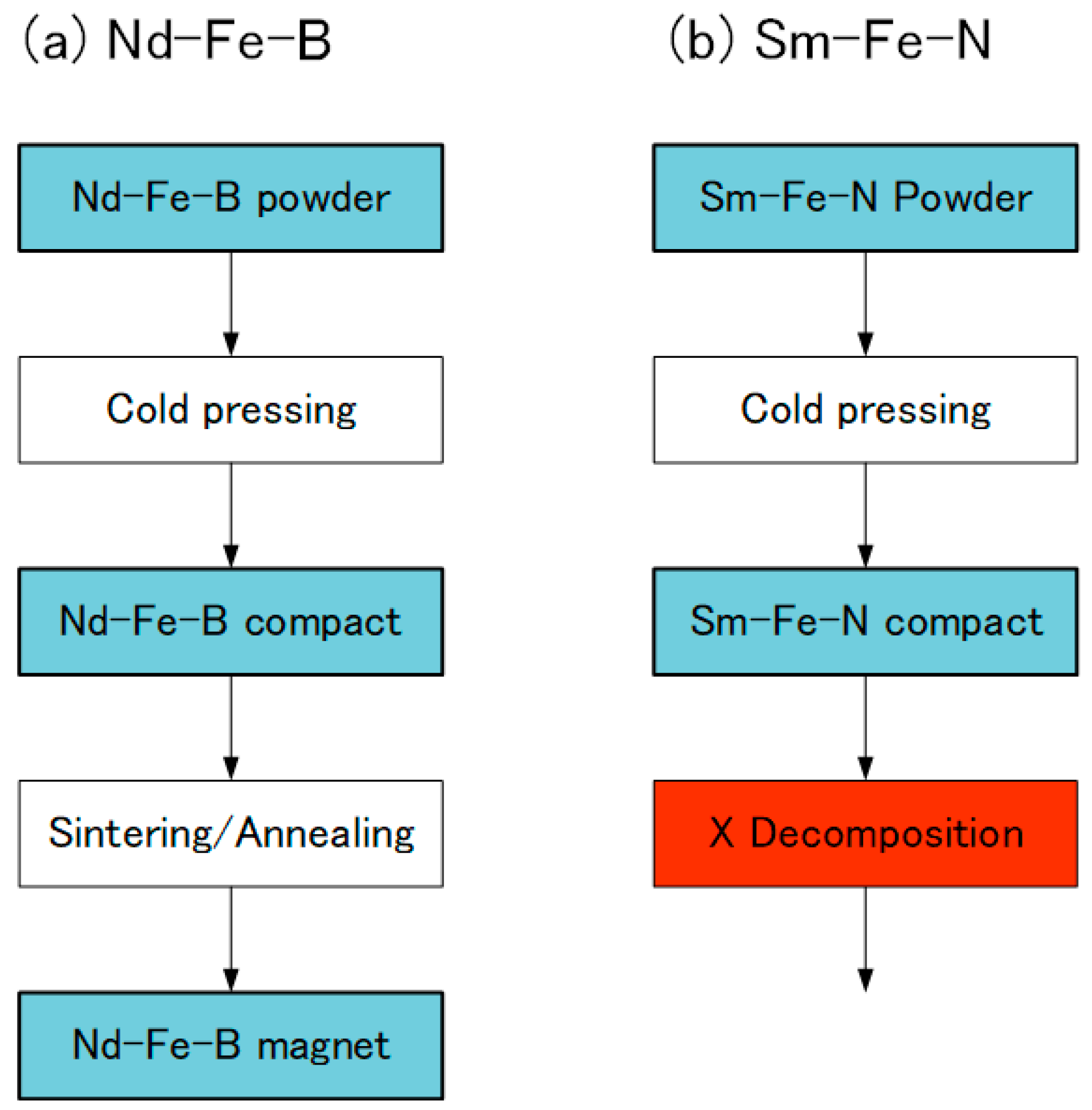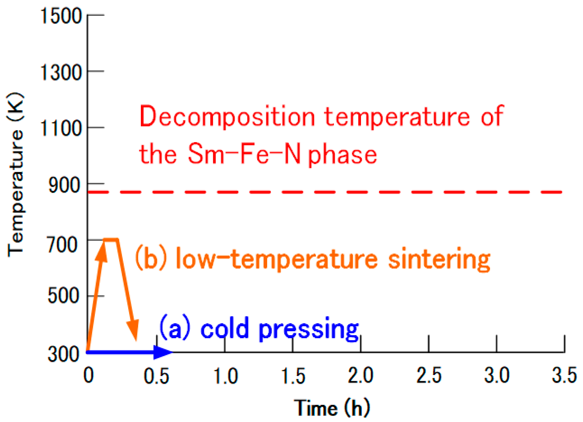 - Takagi, K.; Nakayama, H.; Ozaki, K.; Kobayashi, K. Fabrication of High-performance Sm–Fe–N isotropic bulk magnets by a combination of High-pressure compaction and current sintering. J. Magn. Magn. Mater. 2012, 324, 1337–1341. [Google Scholar] [CrossRef]