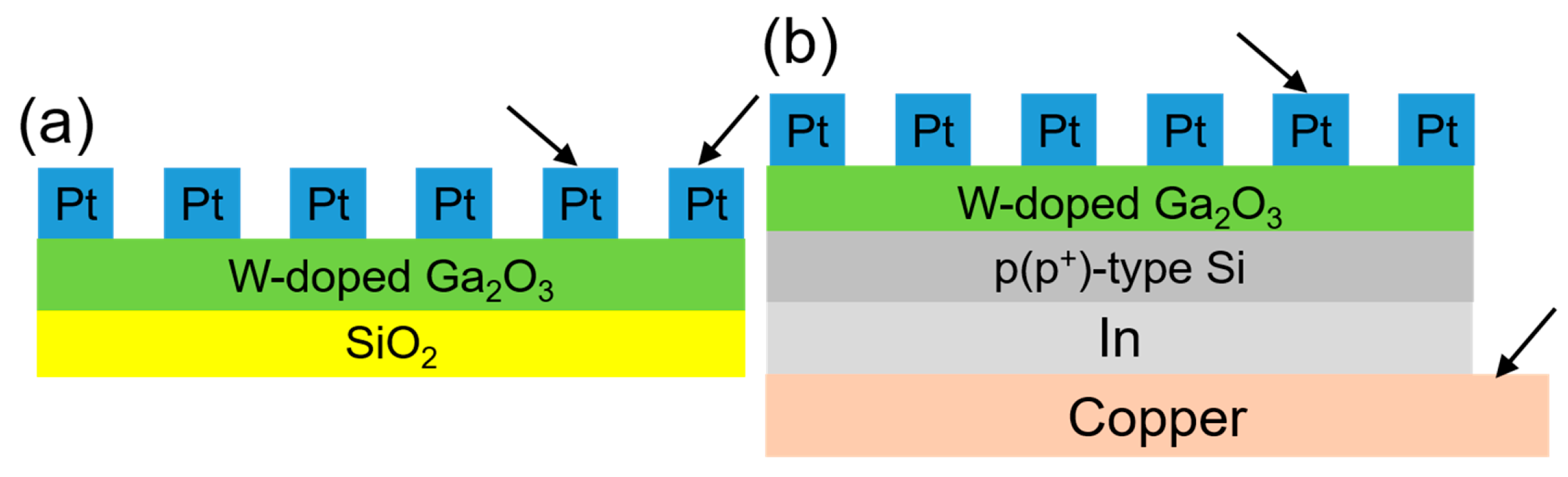+-type Si substrates. Both device configurations exhibit pronounced rectifying behavior, indicating that the W-doped Ga