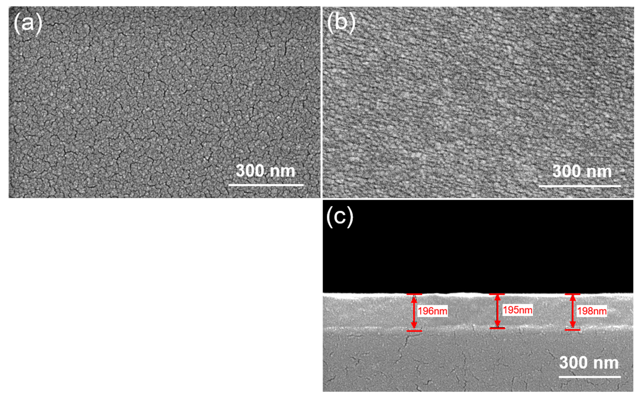 3 thin films. From the image, the film thickness is estimated to be approximately 200 nm. The cross-sectional morphology reveals that the film exhibits excellent thickness uniformity across the entire area, indicating a highly controlled and stable deposition process. This level of uniformity not only reflects the consistency of the E-beam evaporation parameters but also demonstrates the reliability of the process in producing films with well-defined and reproducible thicknesses. Such uniformity is essential for ensuring predictable electrical and optical behavior in device applications, where film thickness plays a critical role in performance.