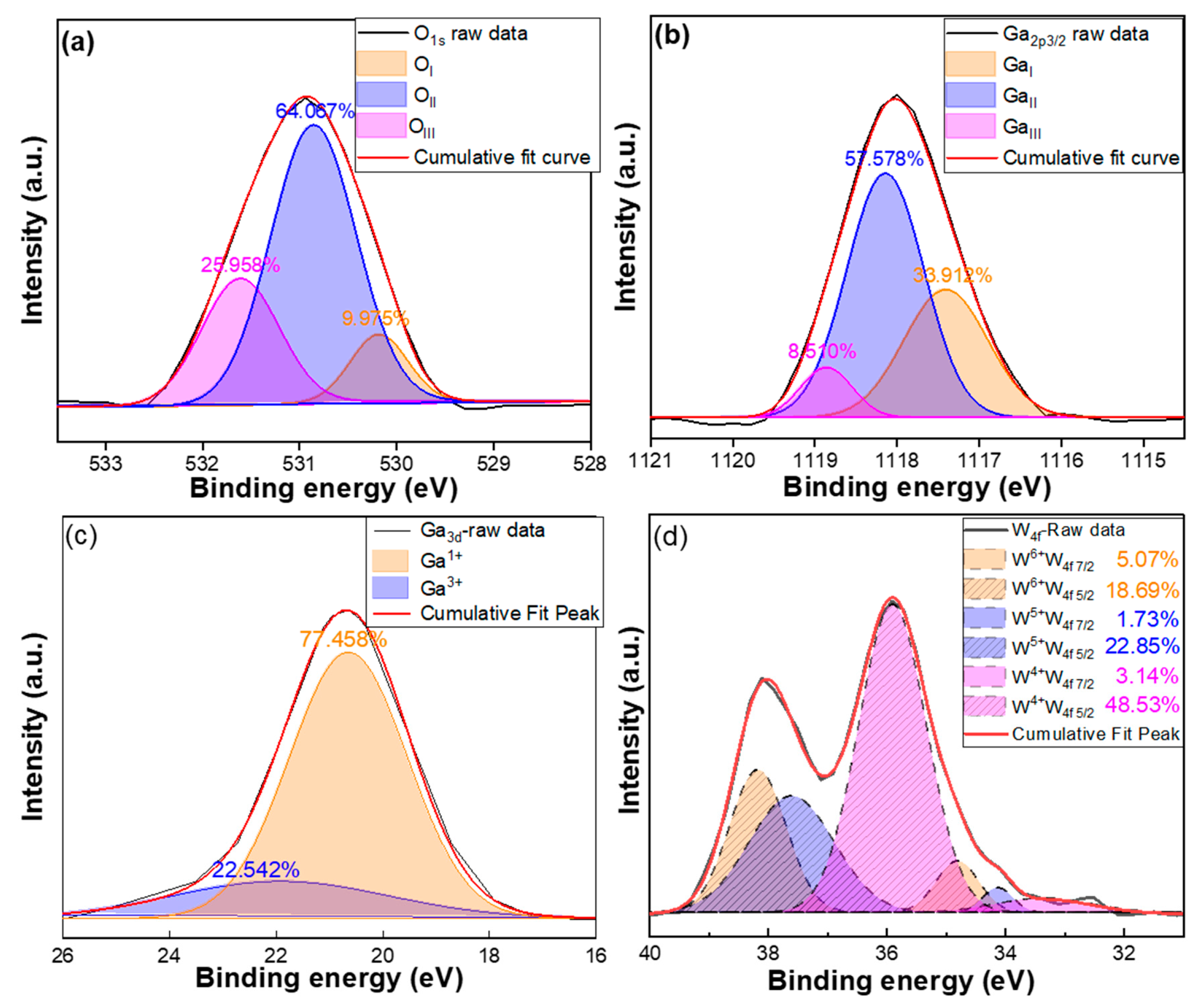 3d peak area, suggests a significant presence of reduced Ga states that may be related to oxygen deficiency or other non-stoichiometric features. This substantial fraction implies that W-doping effectively promotes the formation of donor-like defect states, which are likely favorable for enhancing n-type conductivity and improving the suitability of Ga