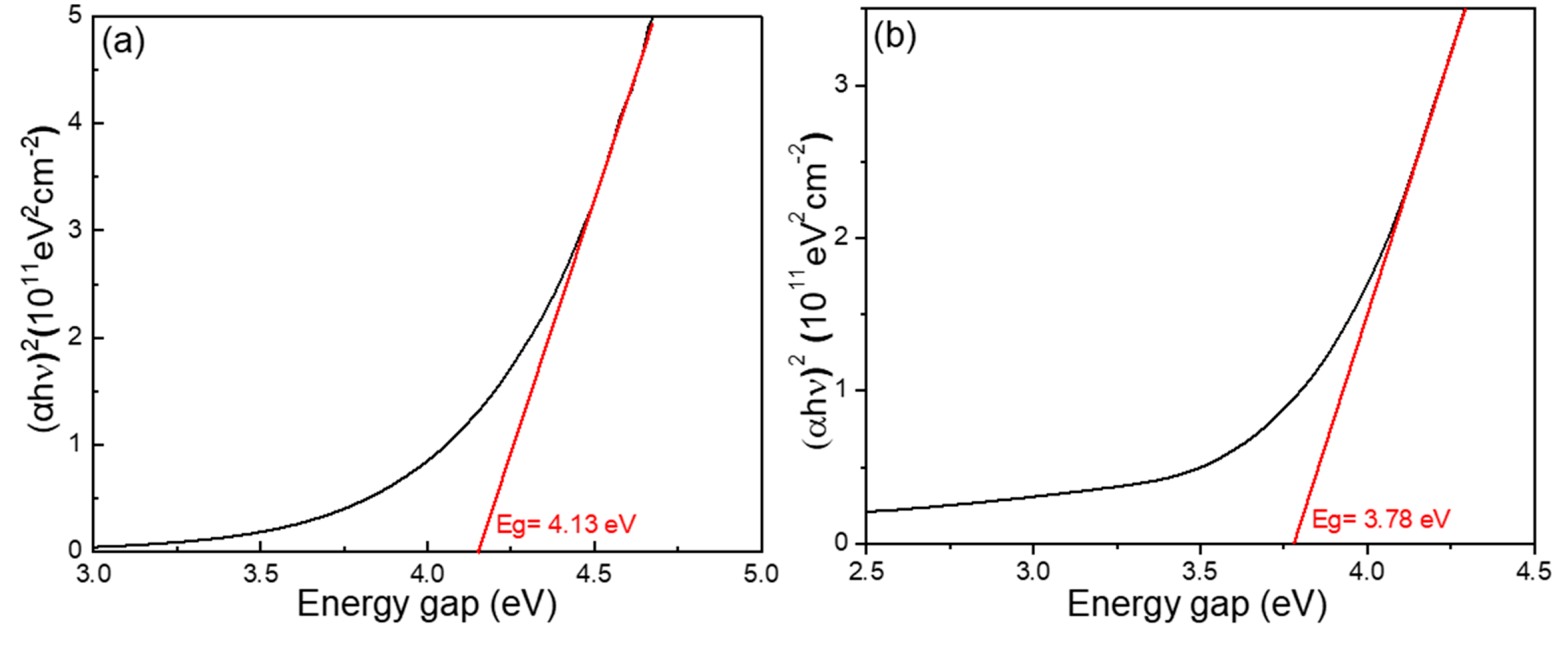 where A is a constant, Eg is the optical bandgap, and n depends on the nature of the electronic transition (for direct allowed transitions, n = 2; for indirect allowed transitions, n = 1/2). As shown in
