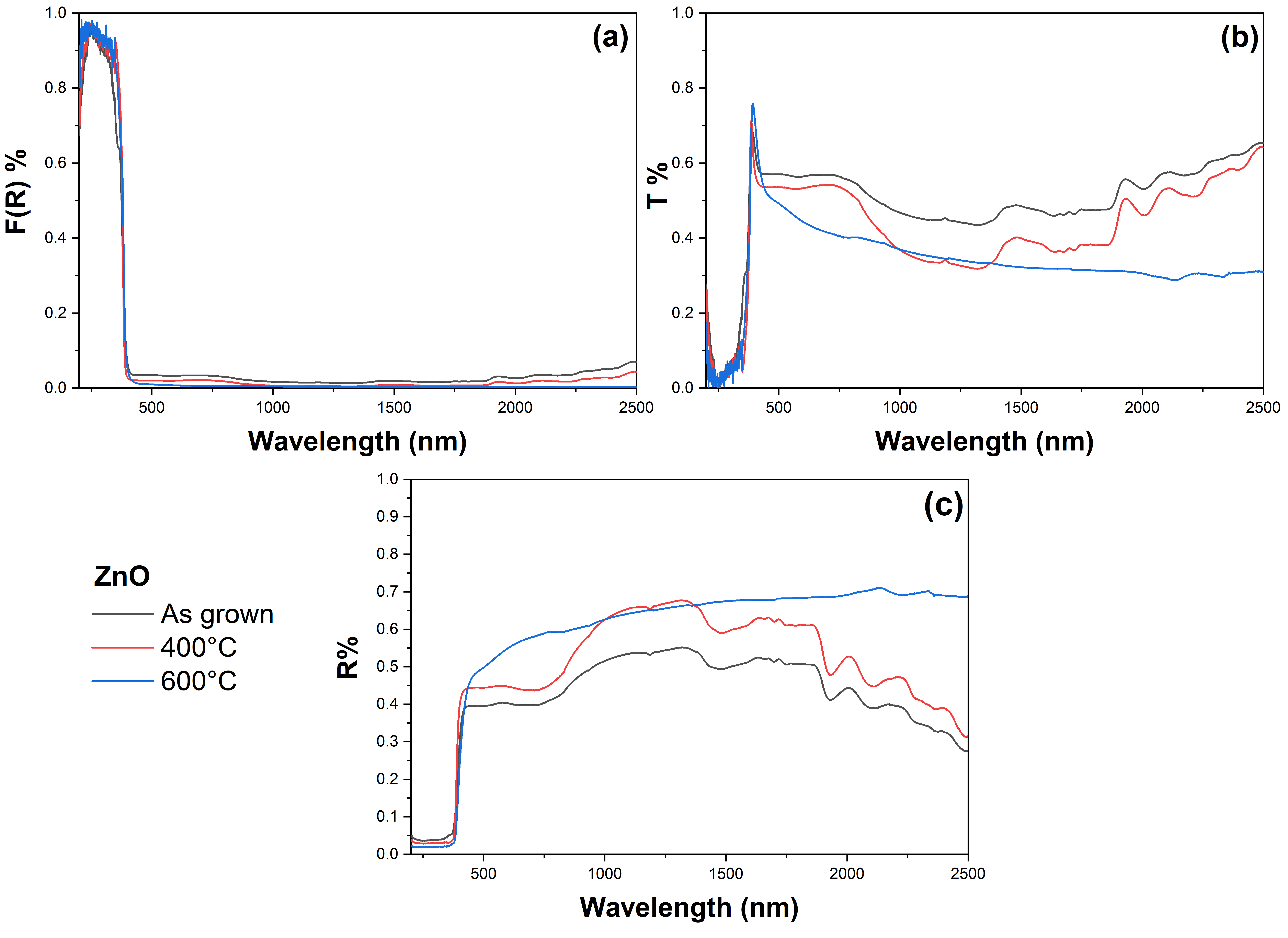The normalized optical spectra of ZnO thin films in the as-grown state and after thermal annealing at 400 °C and 600 °C are presented in Figure 1. Figure 1a shows the absorption spectra, where negligible absorption is observed above ~420 nm, while a sharp absorption edge appears at shorter wavelengths. The position of the edge shifts with annealing temperature, occurring at ~410 nm for the as-grown film, ~402 nm after annealing at 400 °C, and ~400 nm after annealing at 600 °C. Figure 1b displays the transmission spectra, where all films exhibit high transparency (>60%) in the visible range with a steep absorption edge between ~350 and 400 nm. The as-grown sample shows the highest transmittance, while the 600 °C annealed film exhibits the lowest transmittance, consistent with the reflectance increase shown in Figure 1c. The reflectance spectra reveal a sharp rise in the near-UV region associated with the fundamental absorption edge of ZnO. The thin film as grown presents the lowest reflectance across the visible range, whereas annealing at 400 °C leads to a moderate increase, and annealing at 600 °C results in the highest reflectance, particularly above ~450 nm, suggesting changes in morphology and defect concentration [29,30,31,32,33].