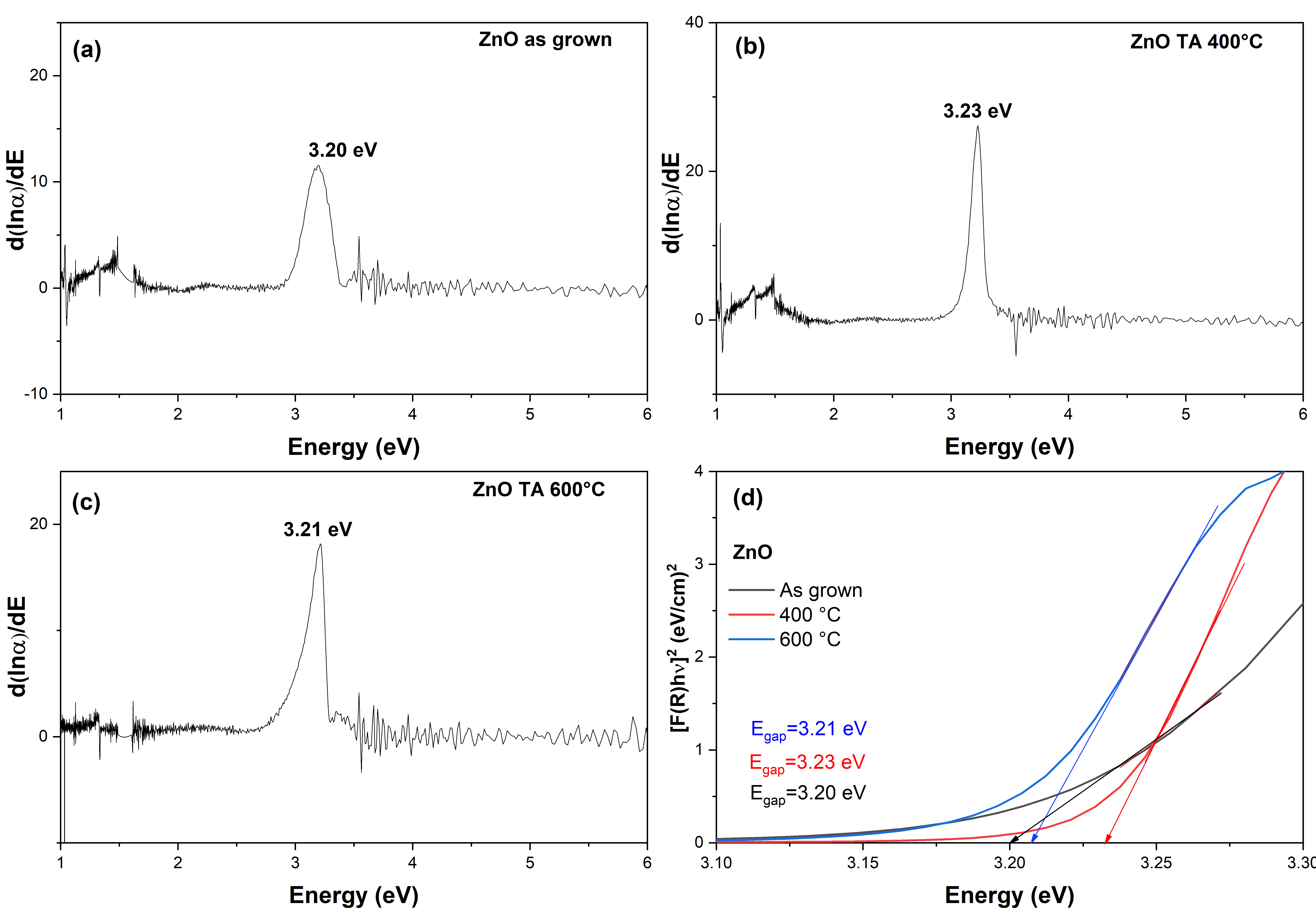 Tauc plot and derivative methods yielded direct band gap values of 3.20 eV, 3.23 eV, and 3.21 eV for the as-grown ZnO thin films, thermally annealed at 400 °C and at 600 °C, respectively, in agreement with reported literature values. The band gap values remain nearly constant, but the absorption edge sharpness is improved with thermal annealing, which we attribute to reduced defect density and relaxation of residual strain in the ZnO lattice.