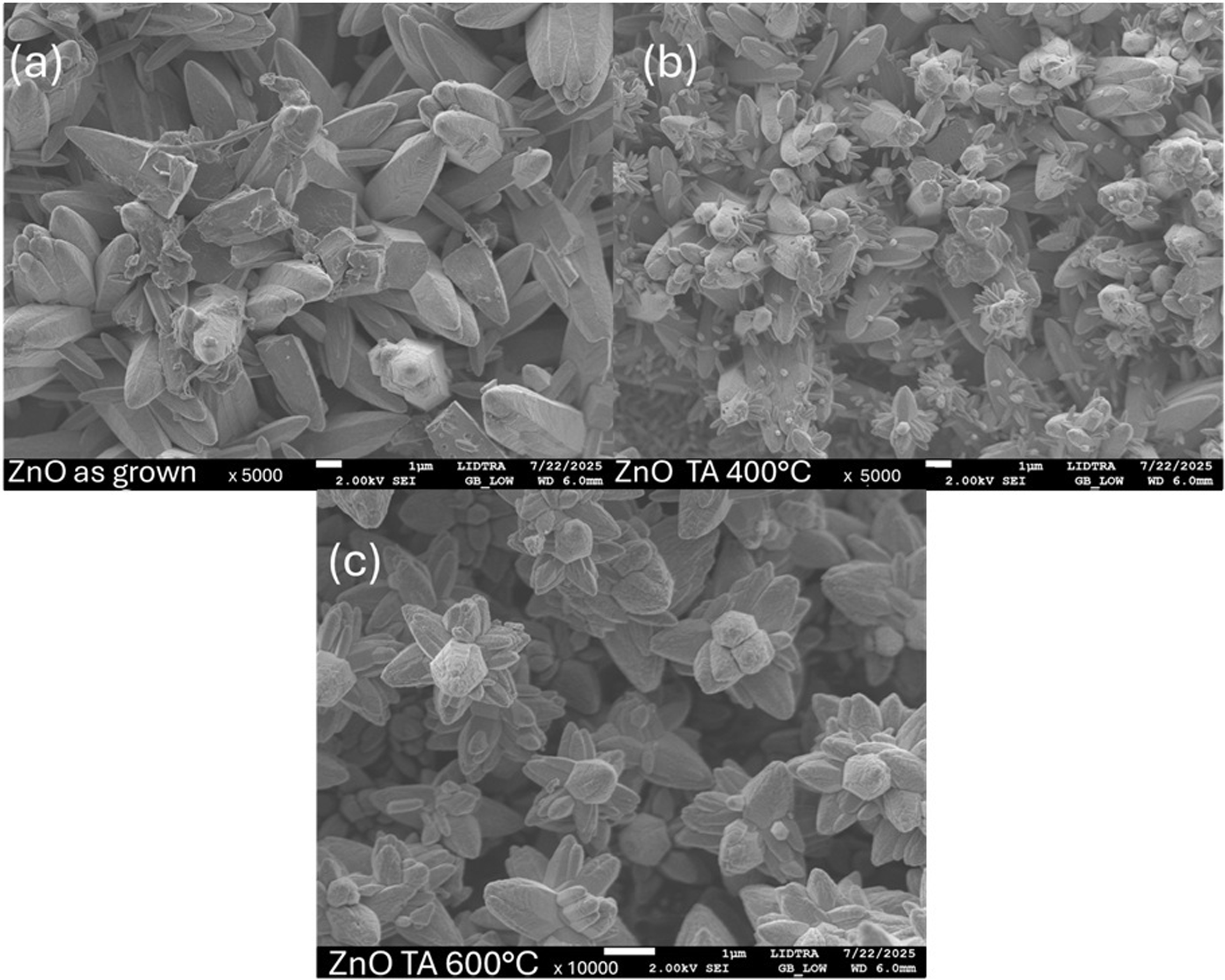 SEM micrographs revealed changes in the morphology of the ZnO thin films. The as-grown thin films exhibited elongated agglomerates oriented in random directions, while thermal annealing promoted their reorganization into flower-like structures. At 400 °C, the agglomerates became more densely packed and firmly adhered to the substrate, and at 600 °C, well-defined, highly symmetrical formations were obtained, consistent with enhanced atomic mobility.