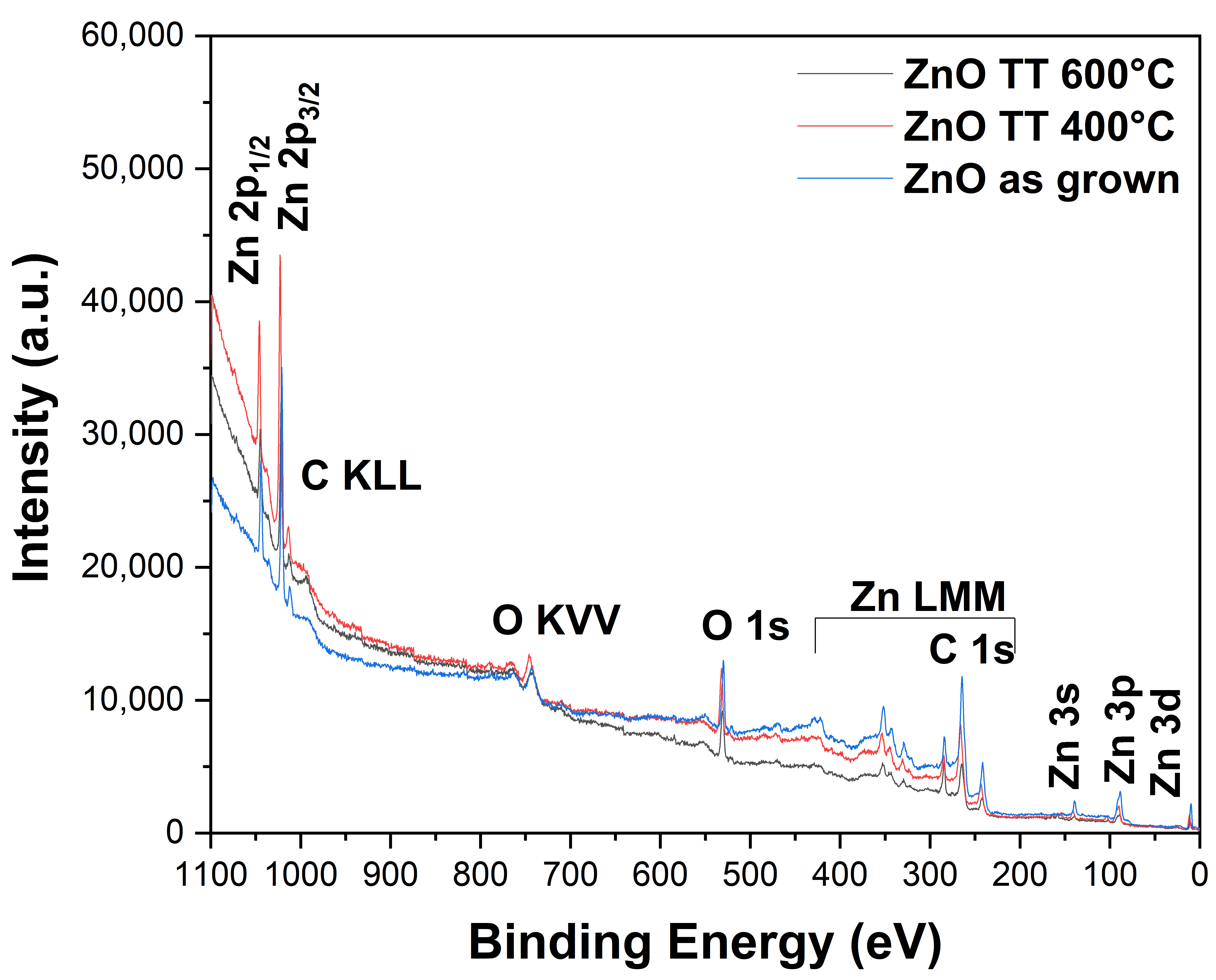 The low-resolution X-ray photoelectron spectroscopy (XPS) analysis, also known as a survey scan, was performed for the ZnO thin film in the binding energy range from 1100 to 0 eV, as shown in Figure 5. The presence of zinc (Zn), carbon (C), and oxygen (O) was detected. However, carbon and oxygen are considered atmospheric contaminants adsorbed onto the sample surface, and therefore also contribute to the O 1s and C 1s spectral regions.