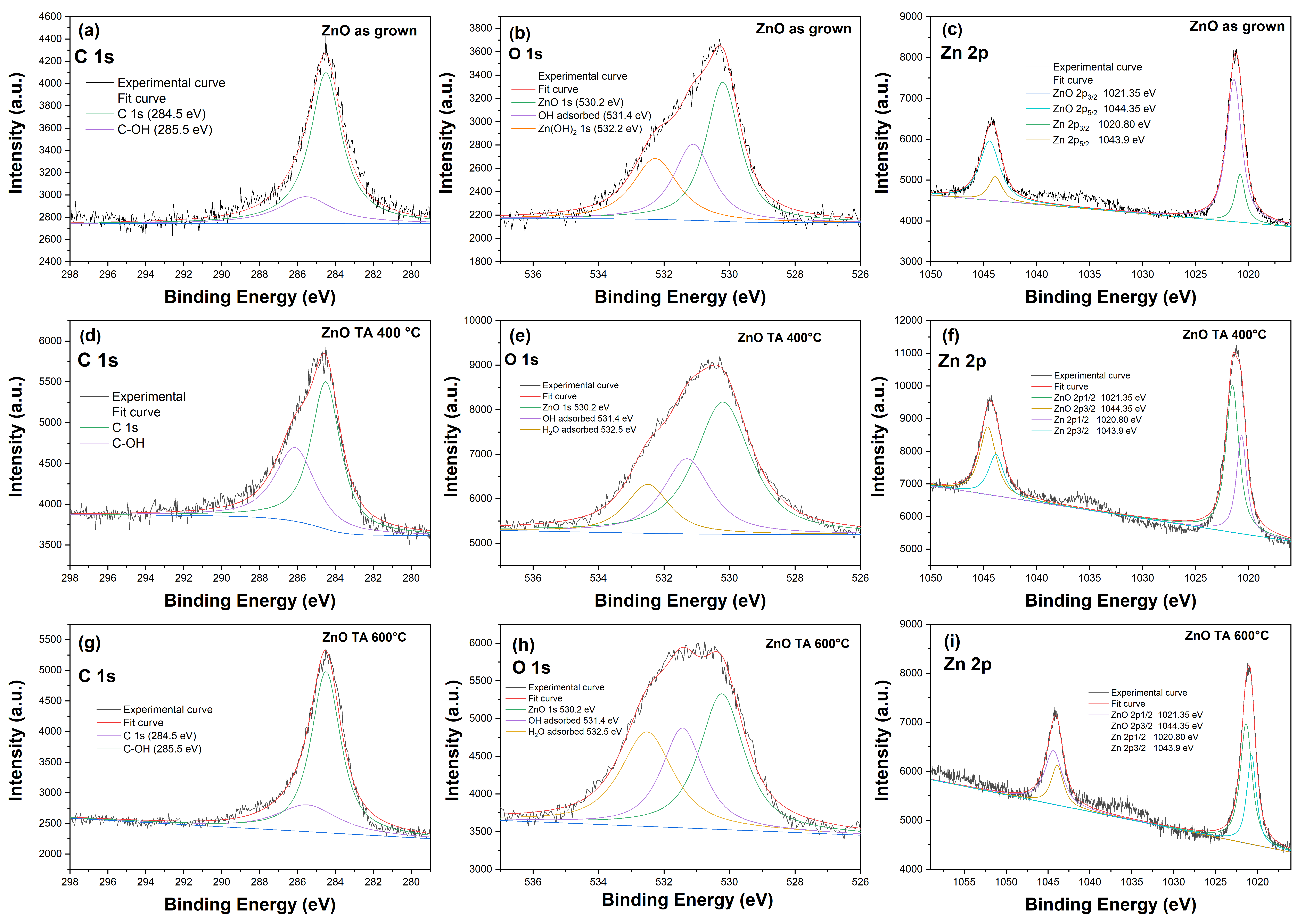 Figure 6. High-resolution XPS spectra of ZnO thin films as grown, annealed at 400 °C and annealed at 600 °C, for the elements (a,d,g) carbon; (b,e,h) oxygen; and (c,f,i) zinc.